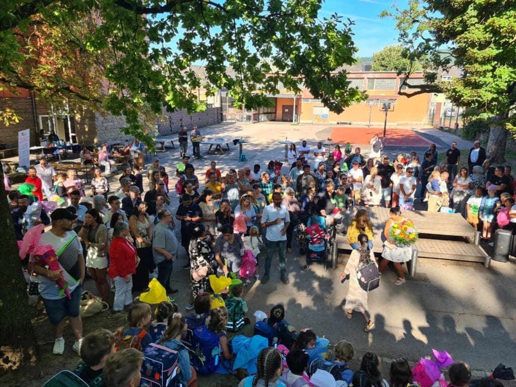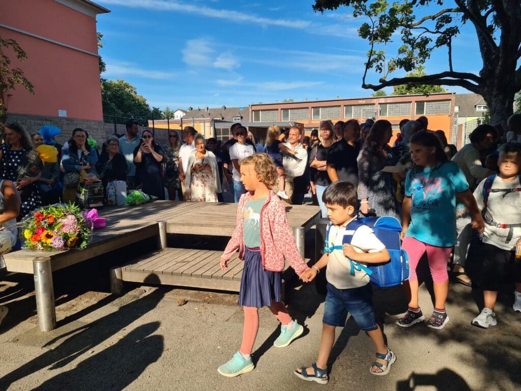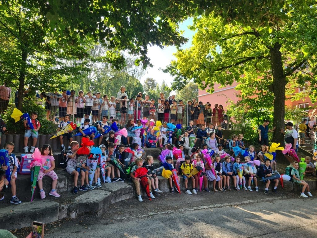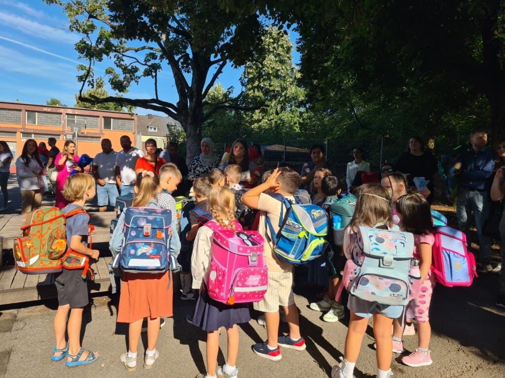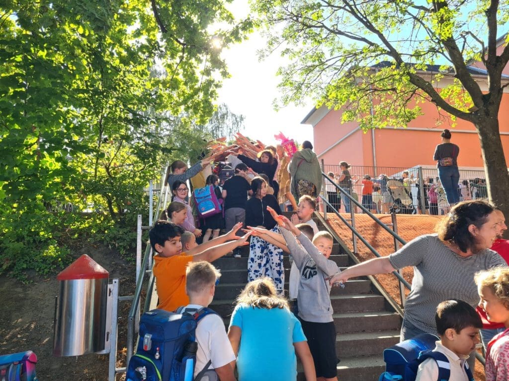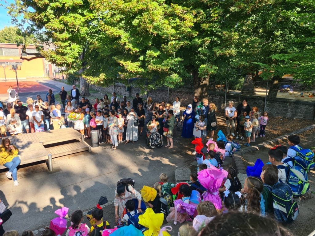 Zuerst gab es eine ökumenische Segensfeier in der Matthias-Basilika, zu der alle Konfessionen herzlich eingeladen waren. Dann wurden die Schulneulinge und ihre zahlreichen Gäste von der Klasse 4b musikalisch auf dem Schulhof begrüßt. Auch die zukünftigen Schulkinder (Schukis) der KiTa Töpferstraße hatte sich mit ihren Erzieherinnen zur Feier eingefunden.