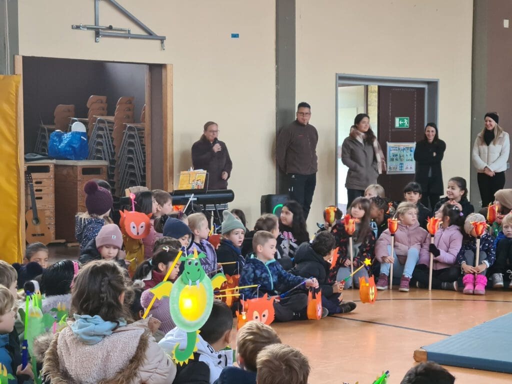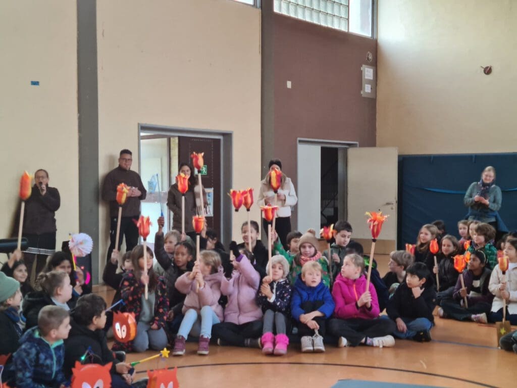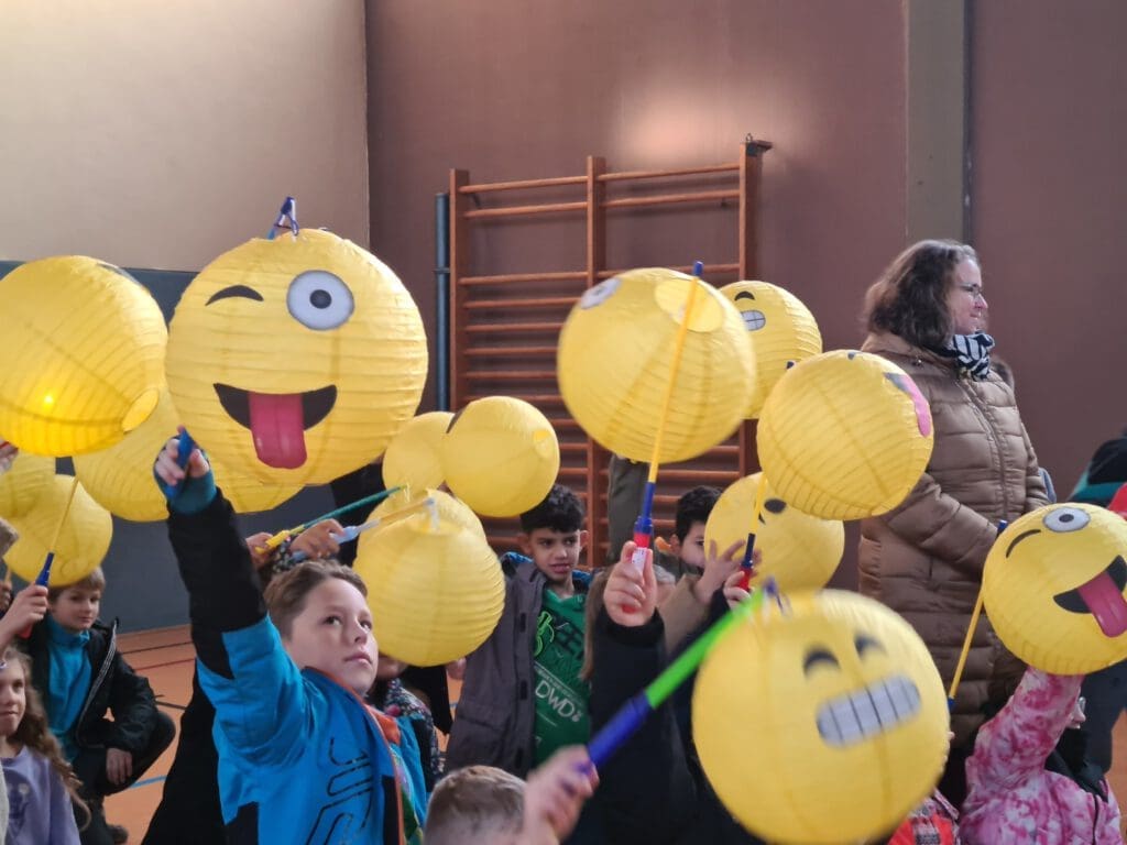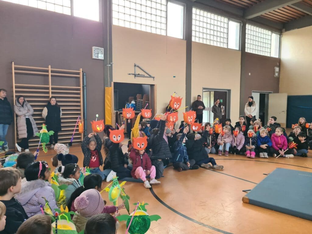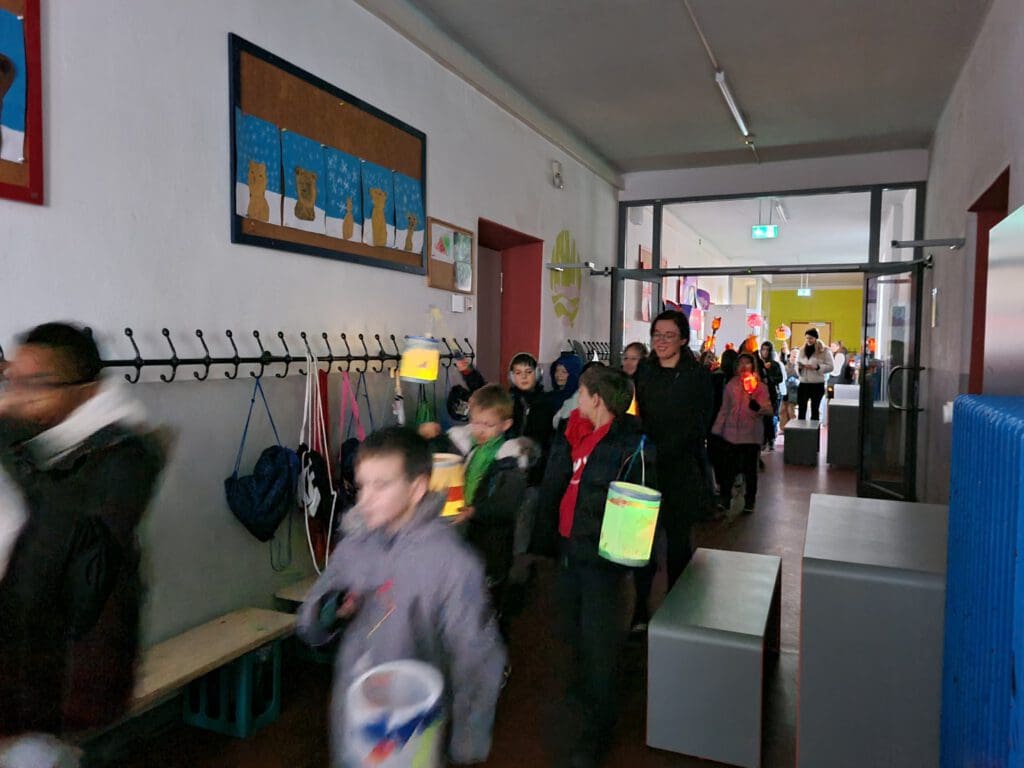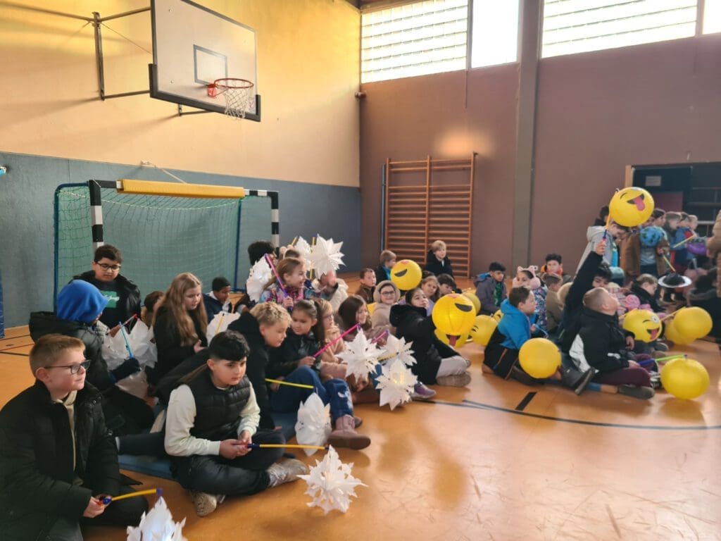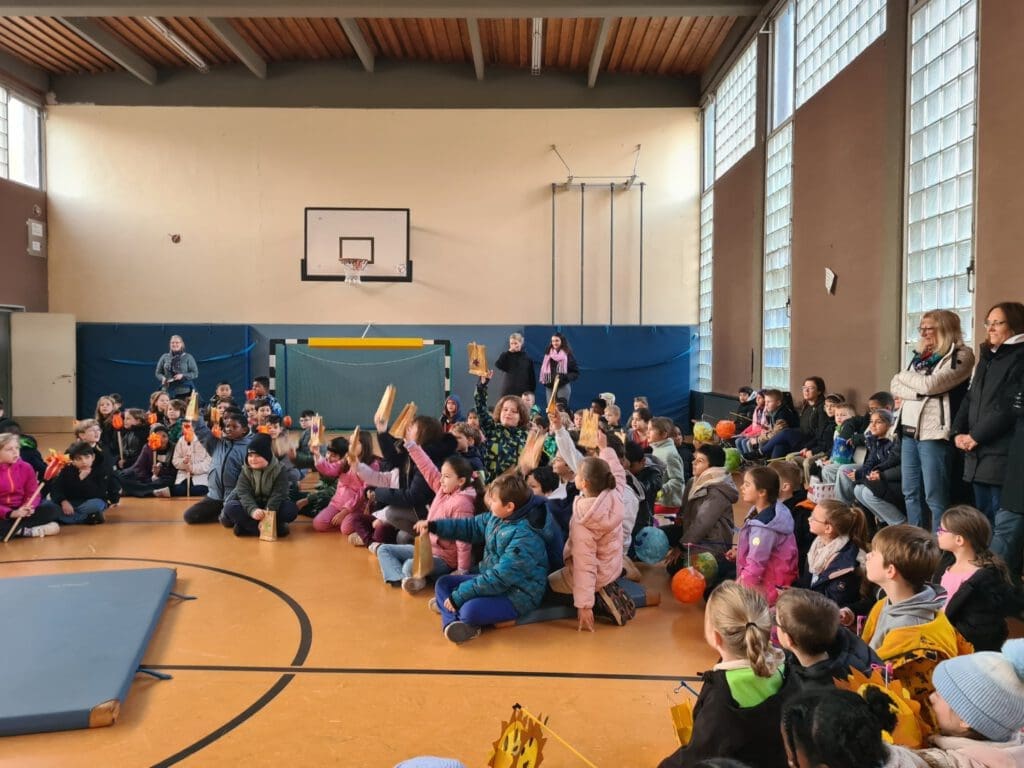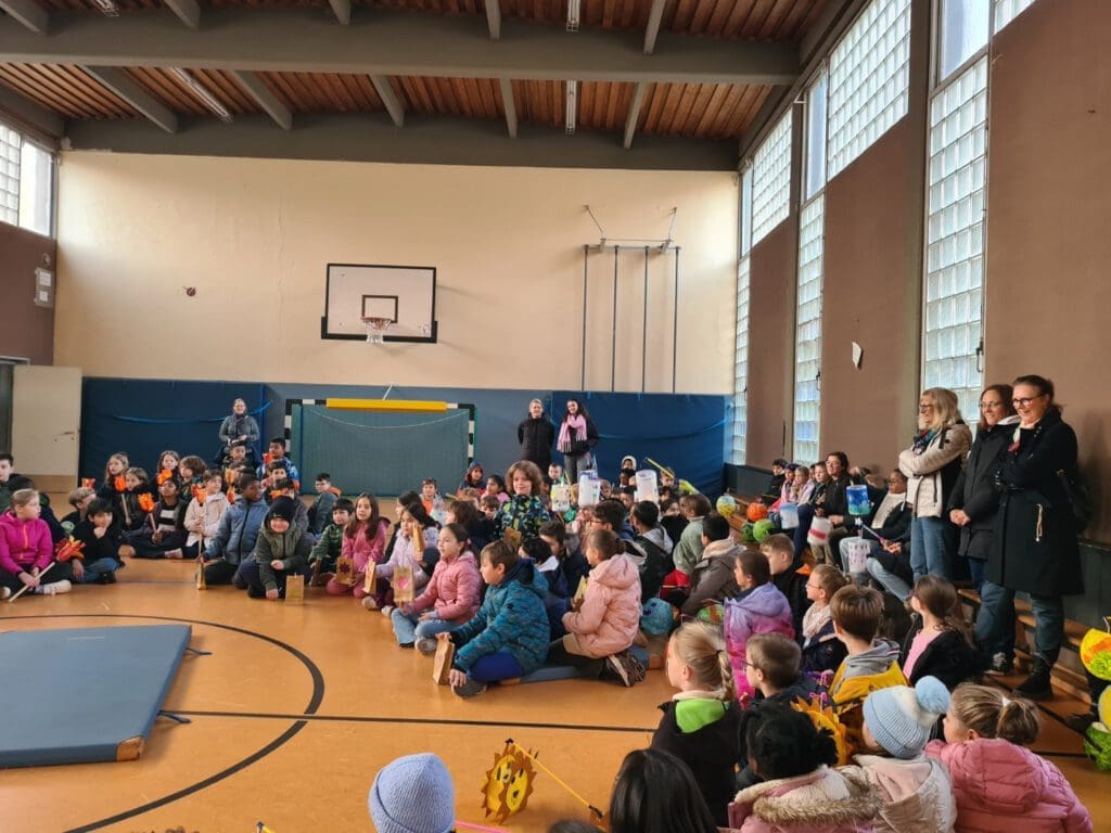 In diesem Jahr startete unsere Martinsfeier mit einem Laternenlauf durch das Schulhaus, das an einigen Stellen noch schön dunkel war. Anschließend trafen sich alle in der Turnhalle zum gemeinsamen Singen unter Begleitung von Frau Müller..