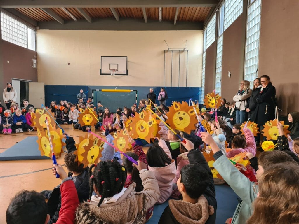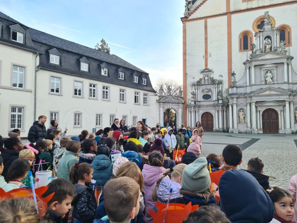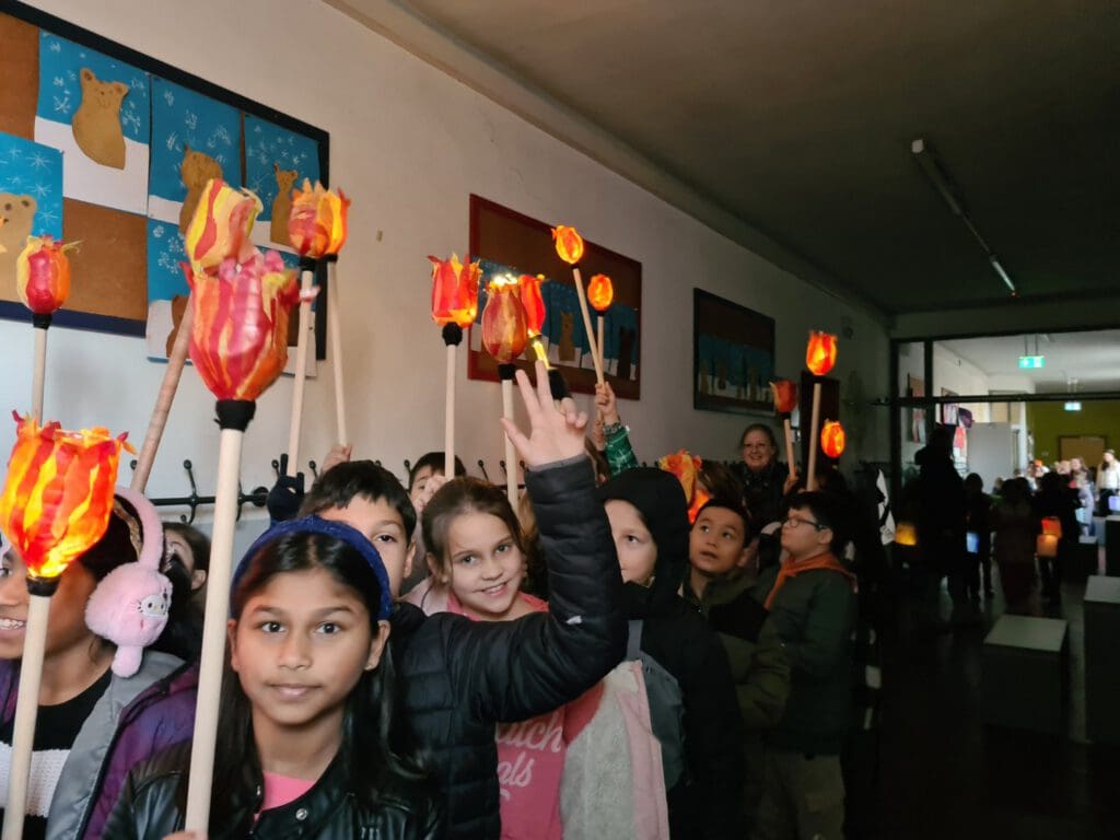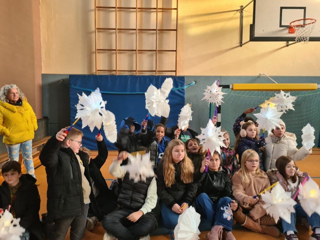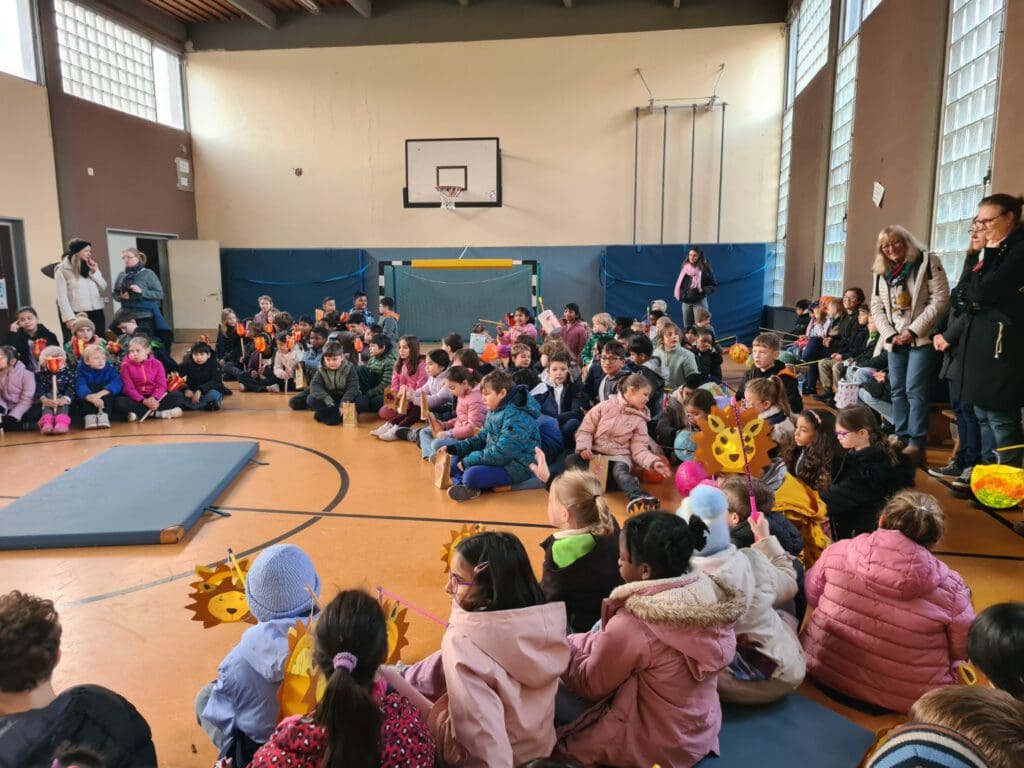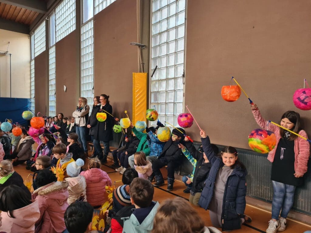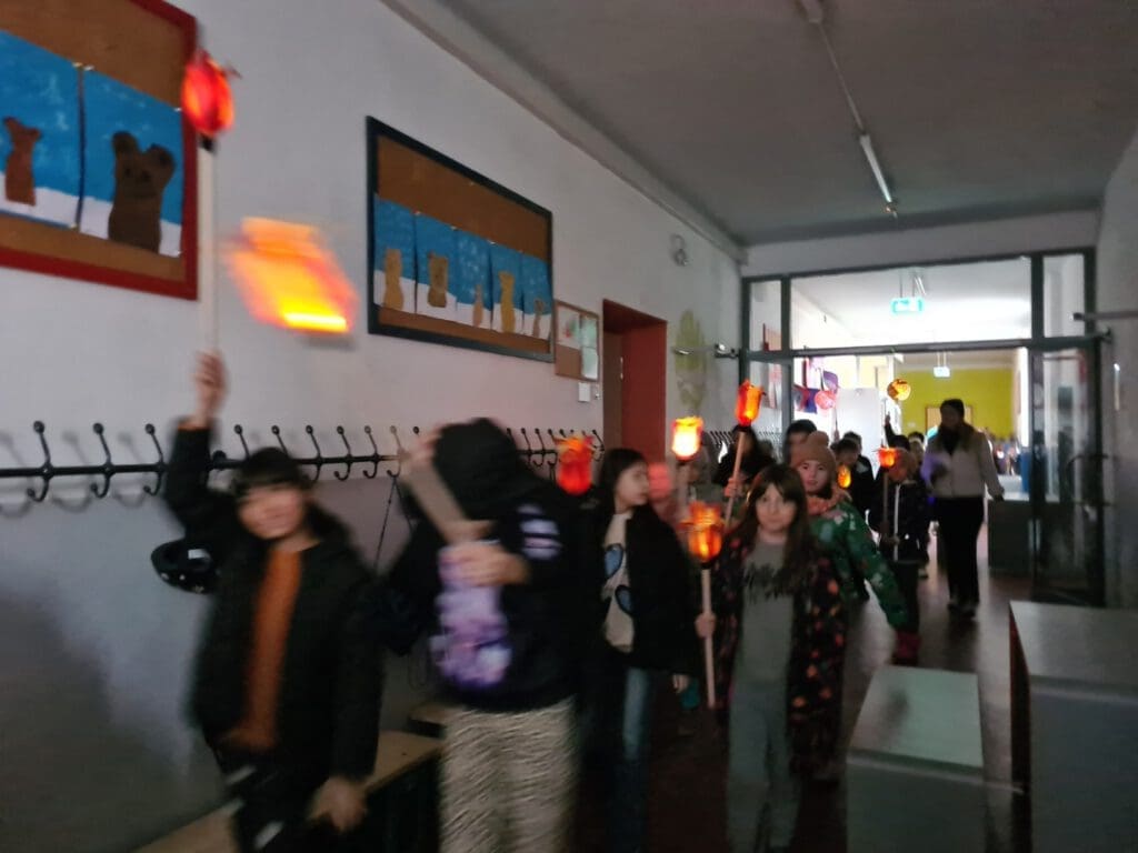 In diesem Jahr startete unsere Martinsfeier mit einem Laternenlauf durch das Schulhaus, das an einigen Stellen noch schön dunkel war. Anschließend trafen sich alle in der Turnhalle zum gemeinsamen Singen unter Begleitung von Frau Müller..