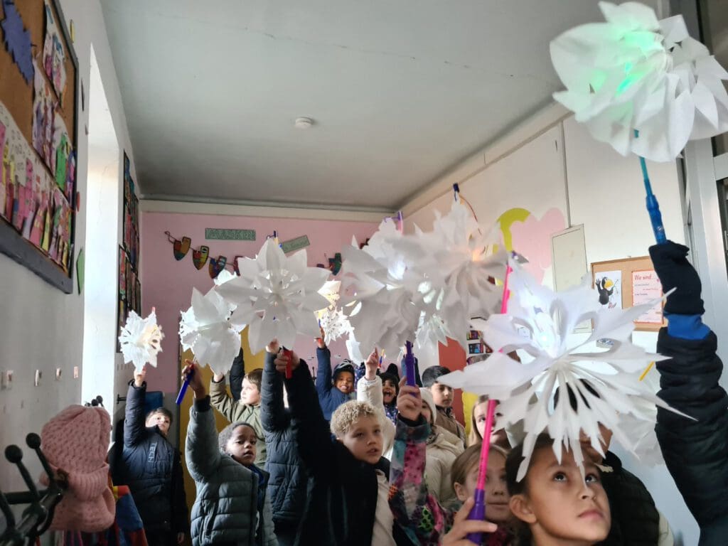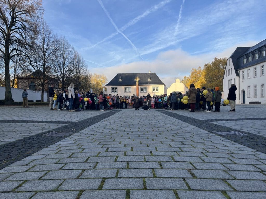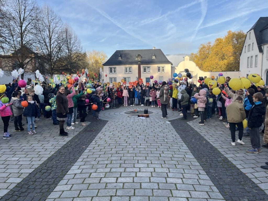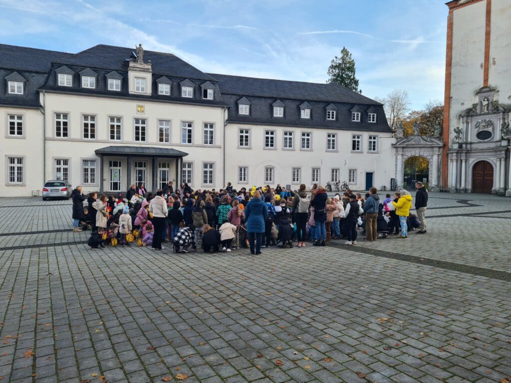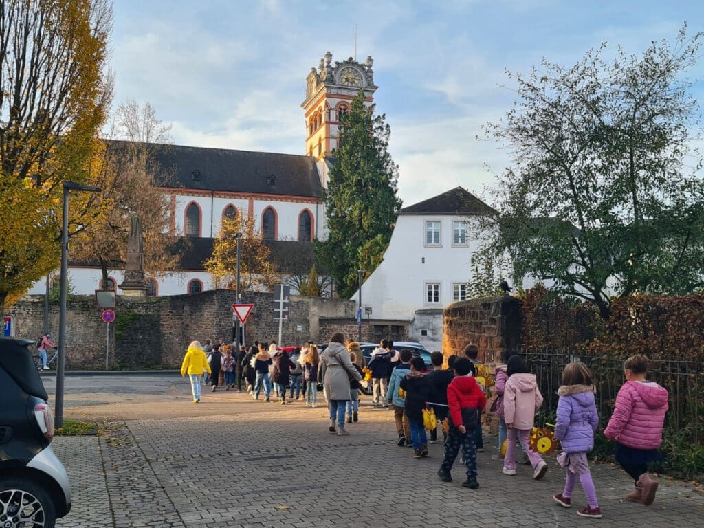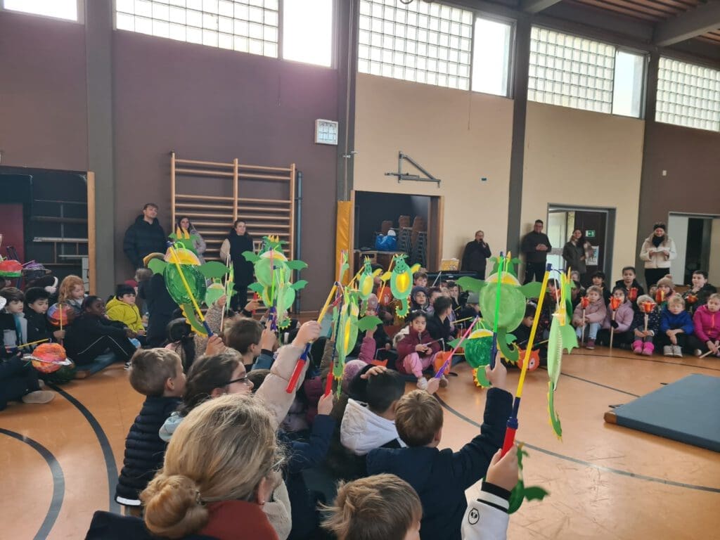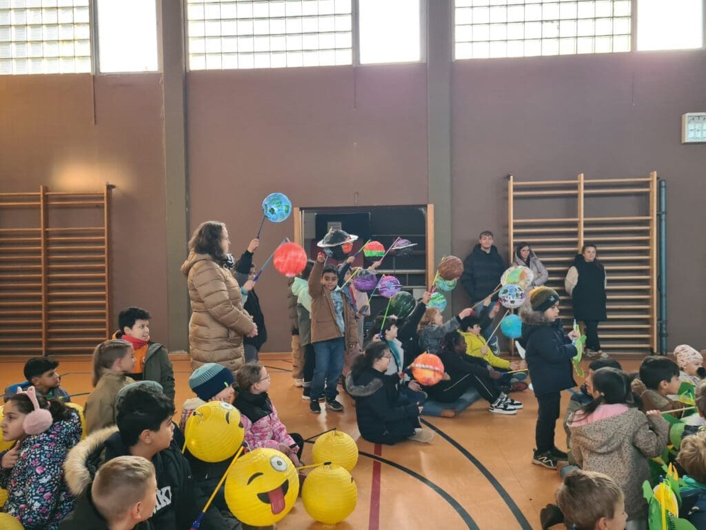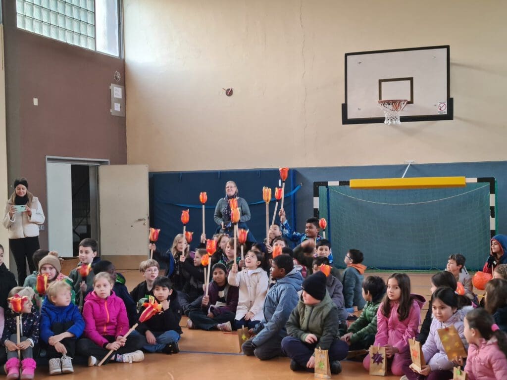 In diesem Jahr startete unsere Martinsfeier mit einem Laternenlauf durch das Schulhaus, das an einigen Stellen noch schön dunkel war. Anschließend trafen sich alle in der Turnhalle zum gemeinsamen Singen unter Begleitung von Frau Müller..