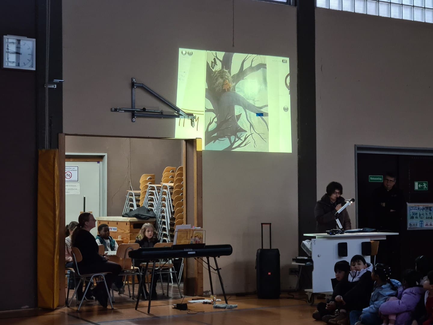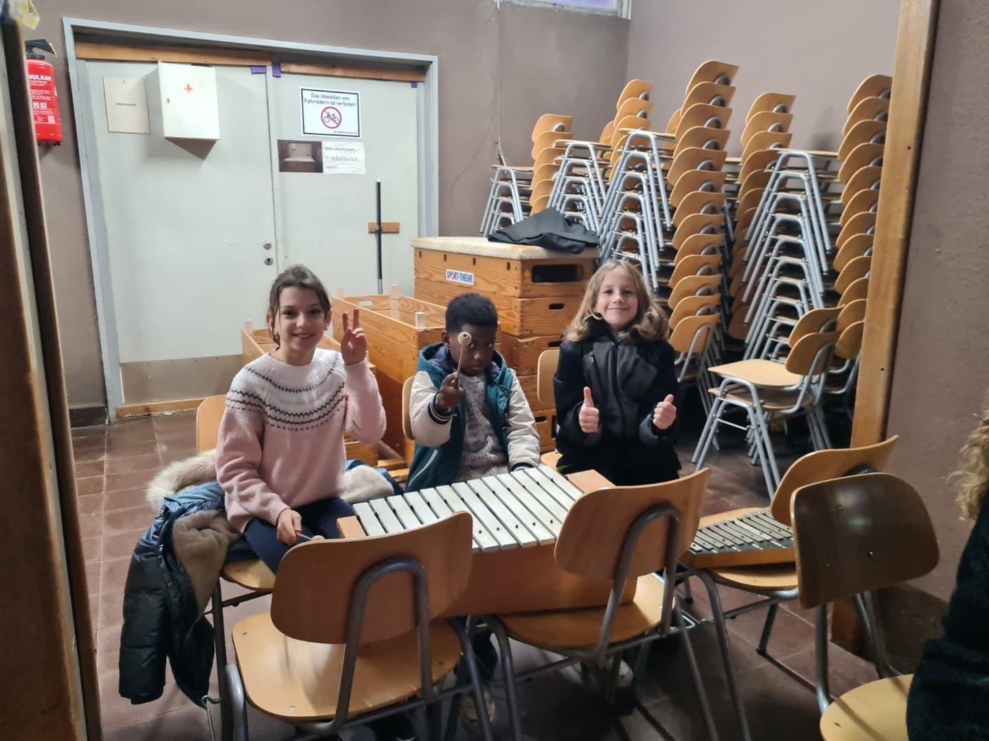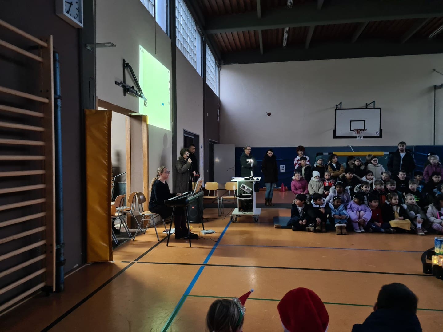 Zum Abschluss las uns Frau Lutz das Buch „Wem gehört das Weihnachtsdings?“ von Madlen Ottenschläger vor. Begleitet wurde sie dabei von 3 Kinder aus der 4a an den Xylophonen.