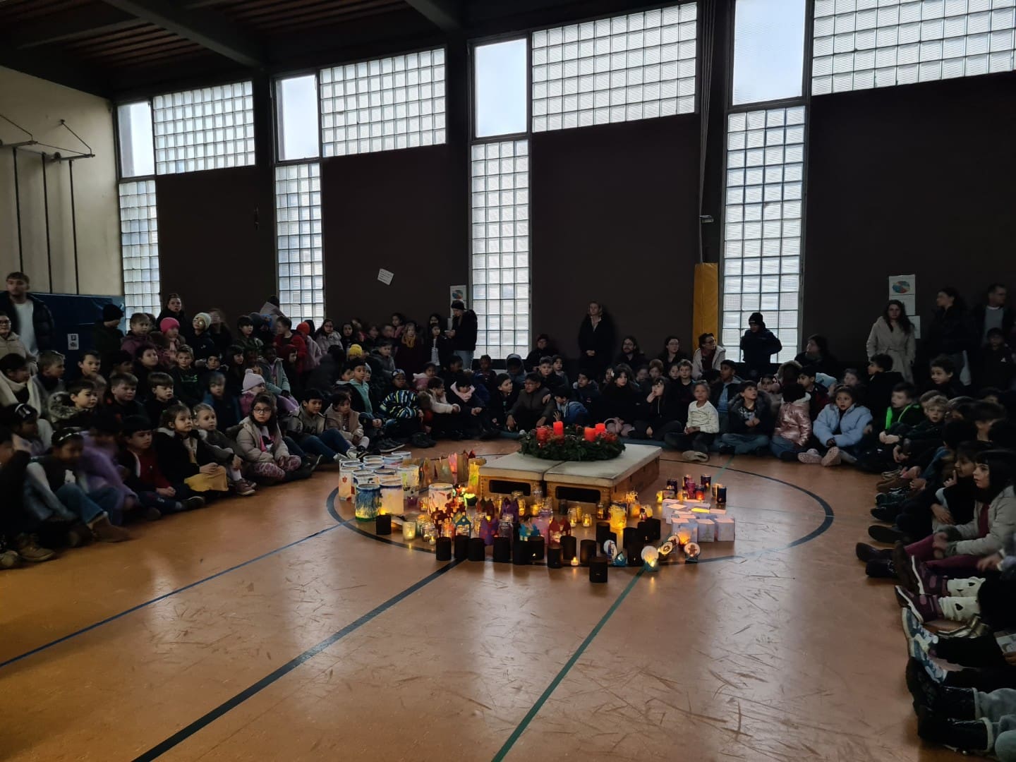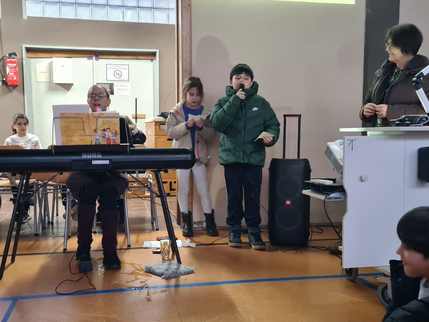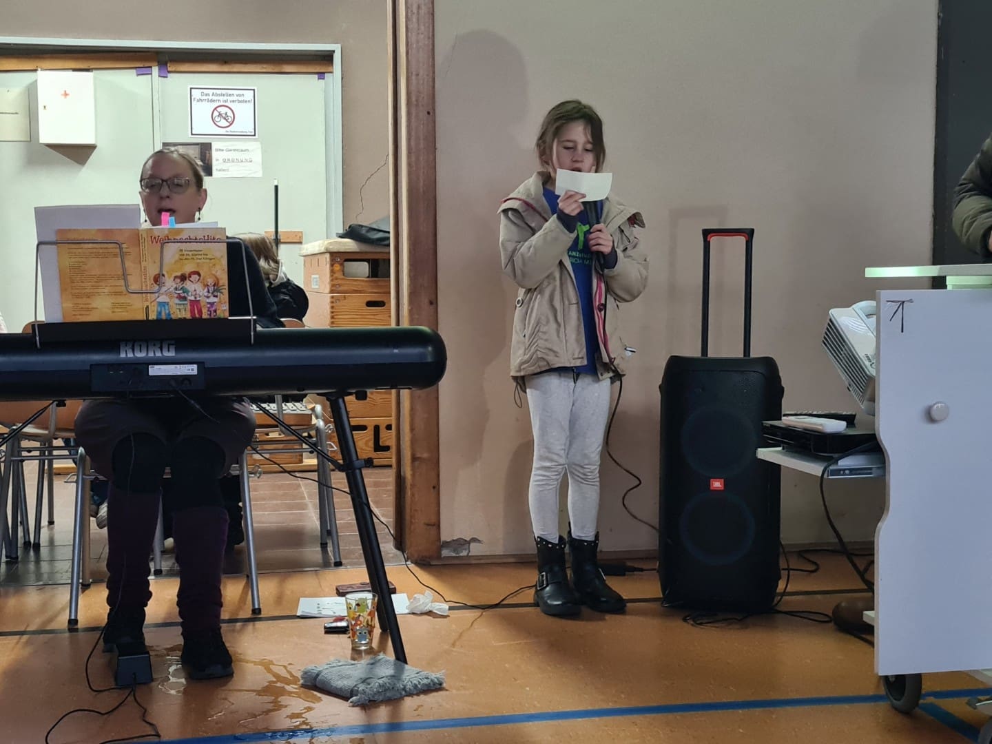 Die Klasse 1c hatte für uns die Weihnachtsbäckerei vorbereitet, die Klasse 2b das Gedicht „Im Advent“. Bei dem Lied „Weihnacht ist auch für mich“ wurden die 3 Strophen erstmals von Solisten gesungen. Alle Kinder gemeinsam trugen das Gedicht „Vorweihnachtstrubel“ von Ursel Scheffler vor und wir sangen die anderen Lieder, die in den Klassen so fleißig geübt worden waren. Wie immer saß Frau Müller am Keyboard.