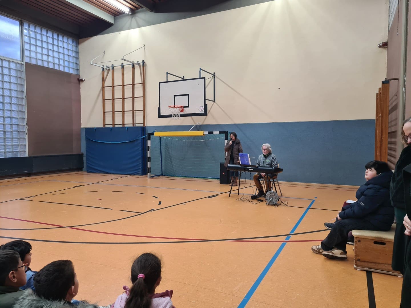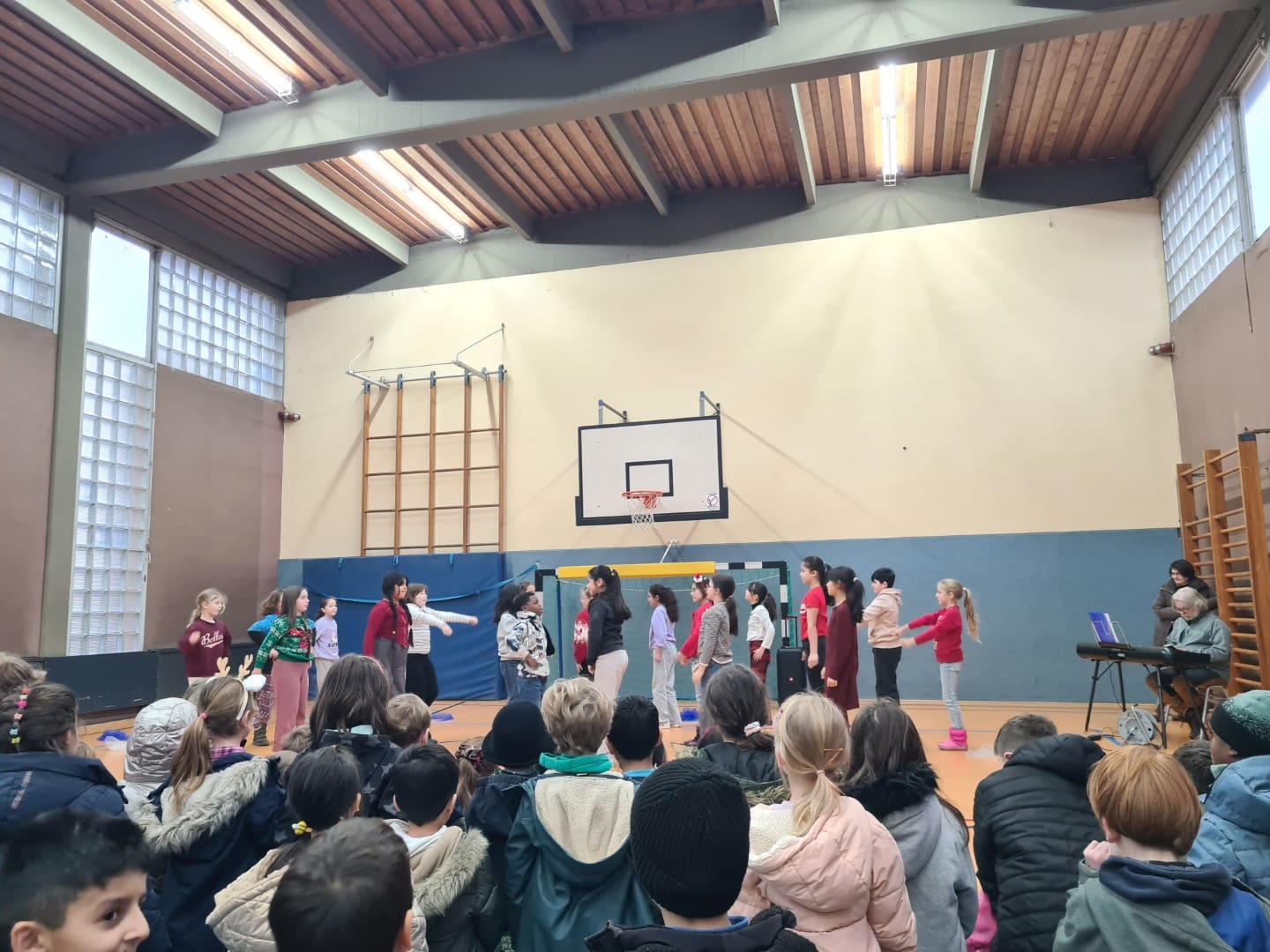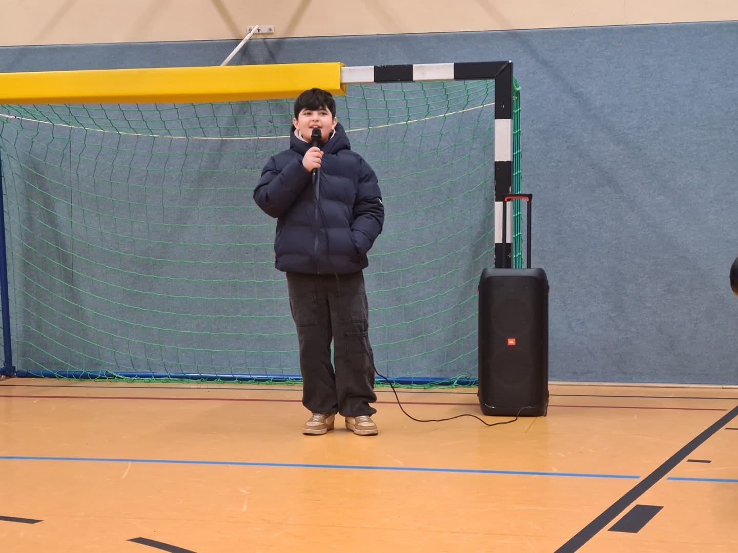 Herr Folz, der das Chorprojekt der 4. Klassen leitet, konnte heute ebenfalls in der Matthiasstunde anwesend sein und begleitete uns beim gemeinschaftlichen Singen. Bei „Weihnacht ist auch für mich“ war Hasan wieder als Solist am Mikrofon.