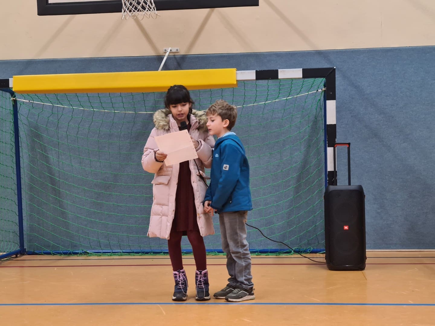 Erstmals übernahmen unsere neuen Schülersprecher Hidaya und Niclas einen Teil der Moderation. Ein Dank ging an unsere vierten Klassen, die wichtige Aufgaben für die Schulgemeinschaft übernommen haben. Die 4a war zuständig für den Toilettendienst in der Frühstückspause und achtete auf das Händewaschen und die Sauberkeit der Toiletten. Die 4b übernahm den Schulhofdienst. Die 4c verteilte donnerstags das Schulobst auf die einzelnen Klassen. Die Klassensprecher bekamen eine Urkunde und ein Geschenk überreicht.