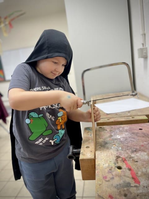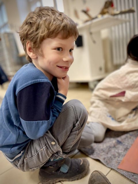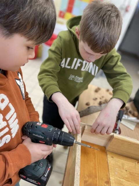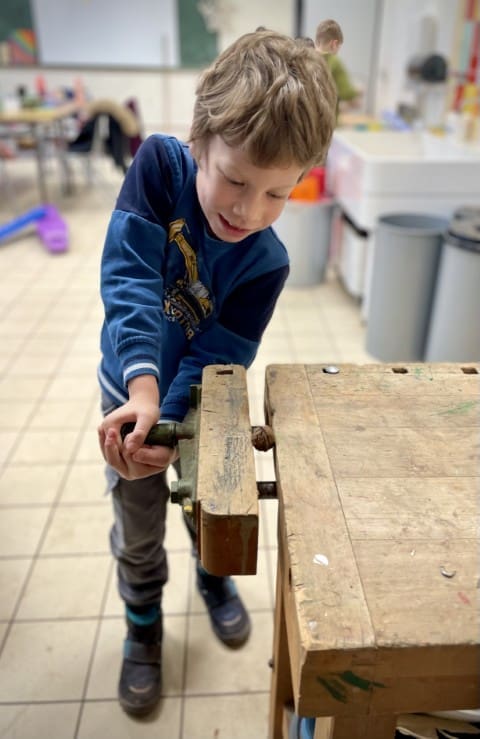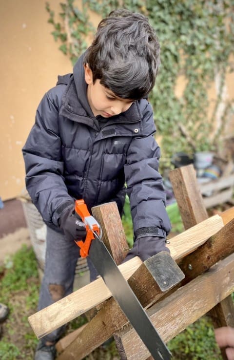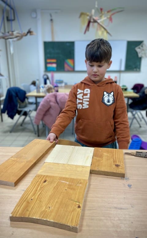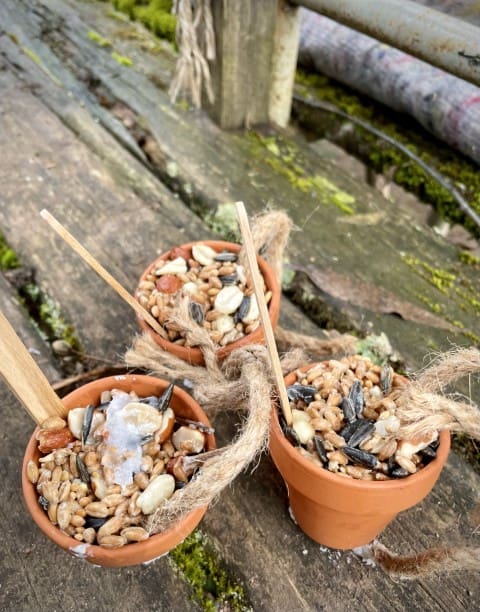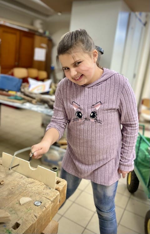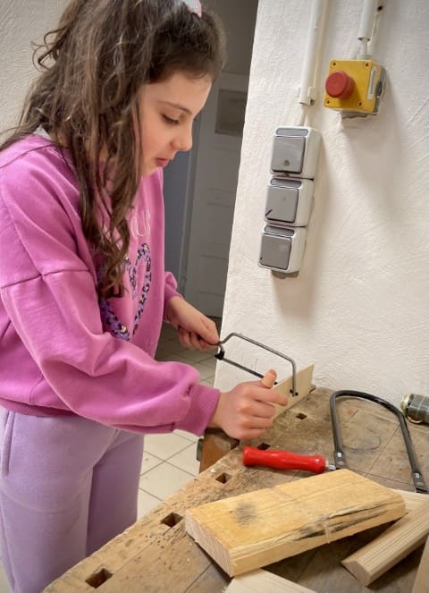 Obwohl wir versuchen so viel Zeit wie möglich draußen im Garten zu verbringen entscheiden wir uns in der ersten der beiden Wochen dazu, den Vormittag im Werkraum zu verbringen, es regnet einfach viel zu viel. Und auch hier gibt es mehr als genug für den Garten zu tun. Es wird gewerkelt, gesägt, gehämmert und geschraubt. Wir gestalten Schilder und Elemente für den Garten mit Farbe und versuchen uns mit Erfolg an Meisenknödeln und Futterstellen für die Vögel.