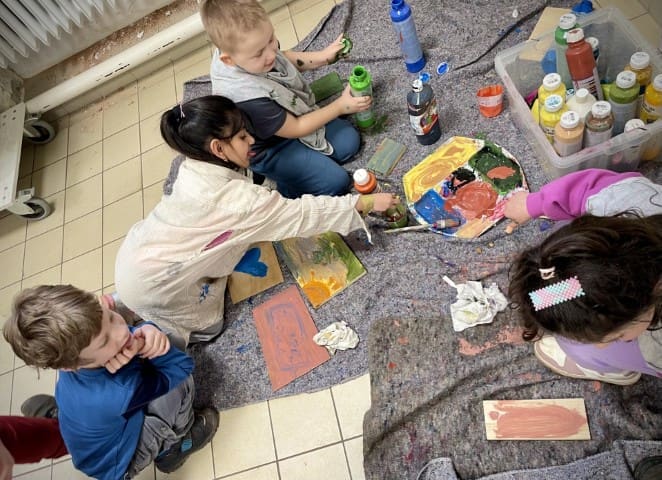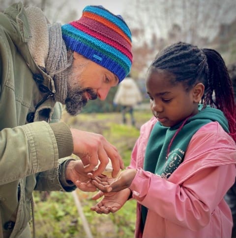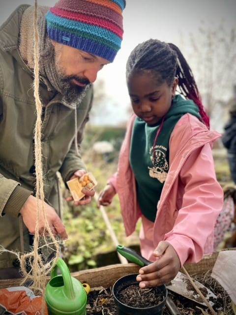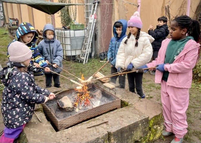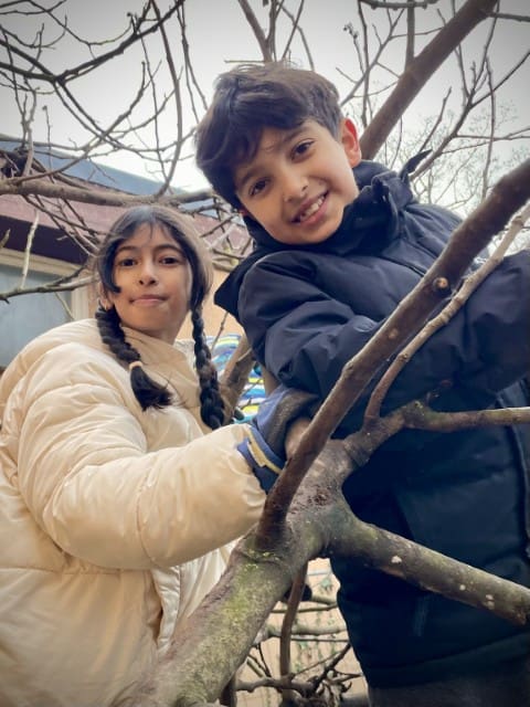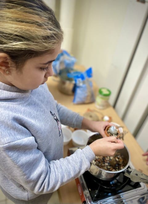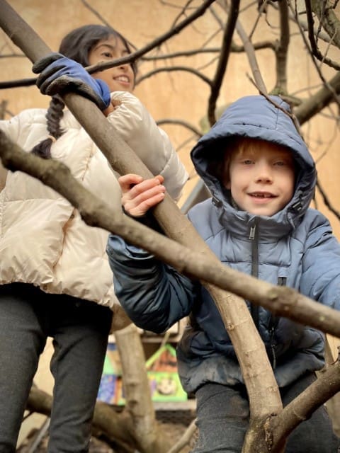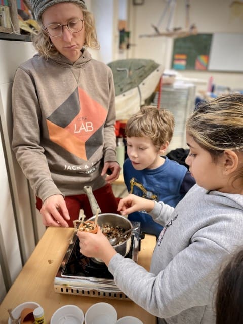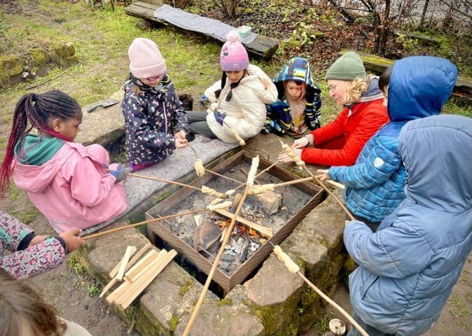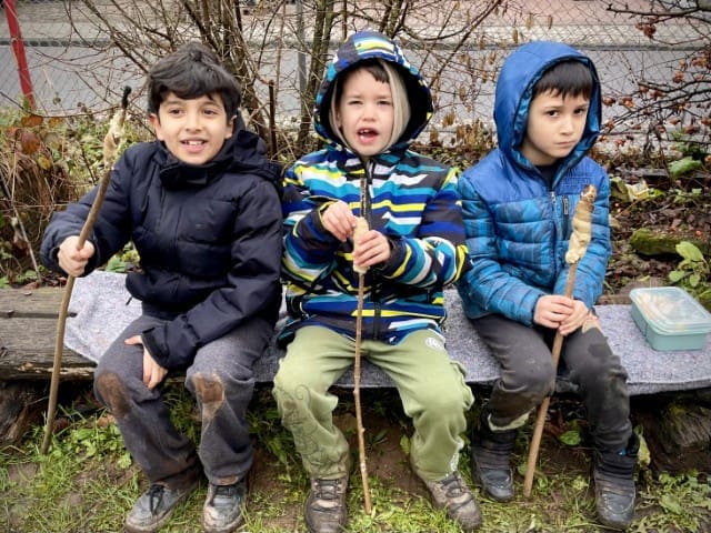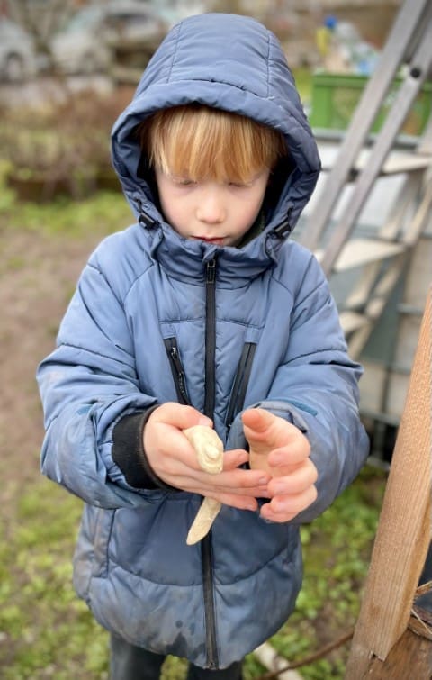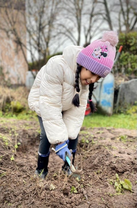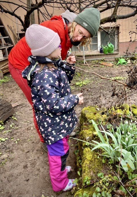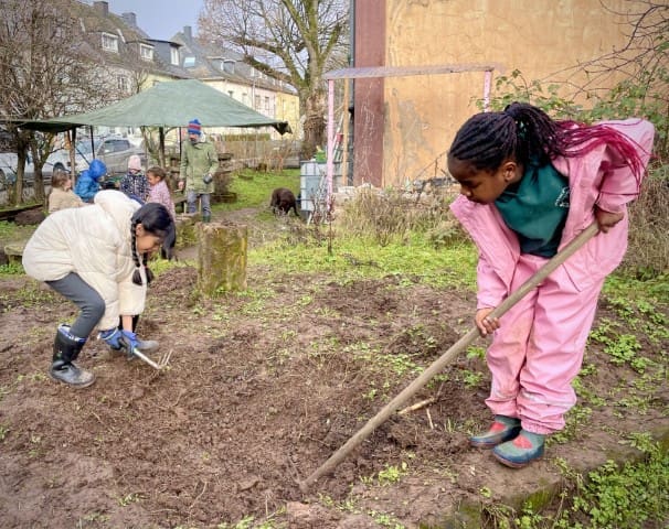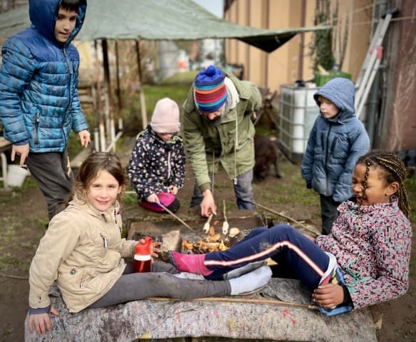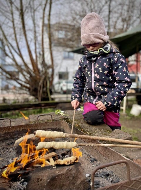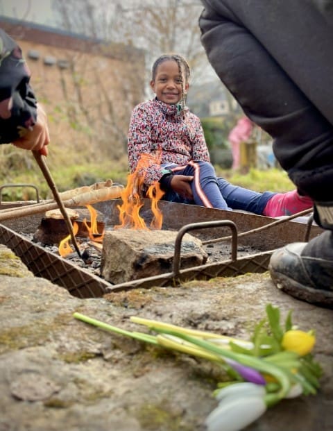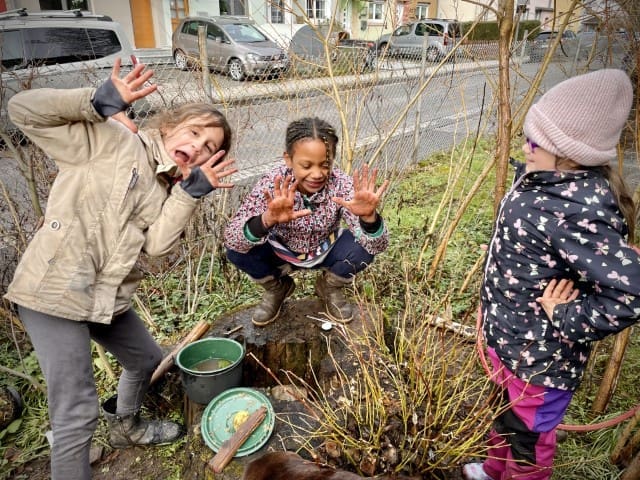 In der zweiten Woche geht es nach draußen. Wie immer wird viel geklettert und gegraben, und natürlich gibt es auch wieder Stockbrot. Spontan wird noch eine Kartoffel-Blumen-Matschsuppe gekocht und wir bringen die ersten Samen zum Vorziehen in die Erde.