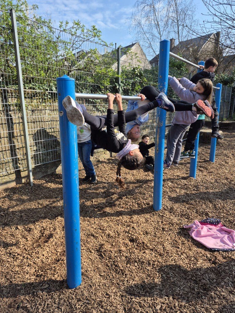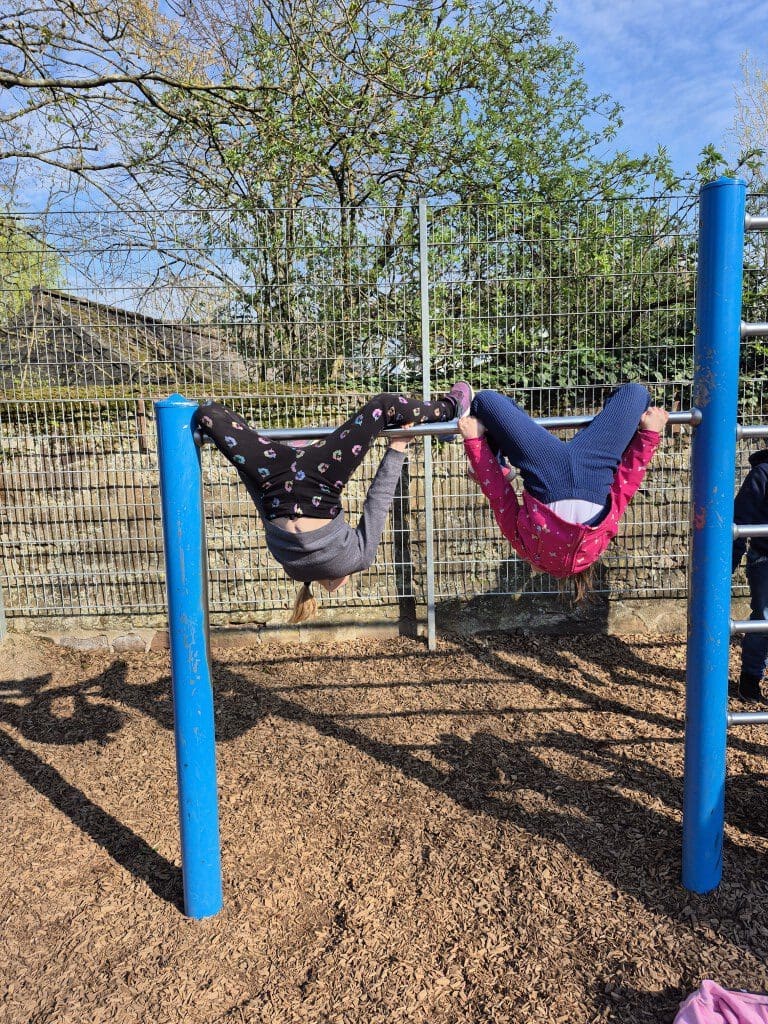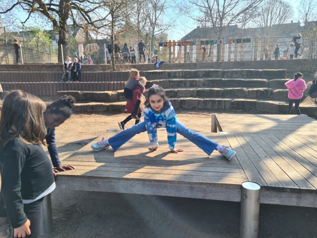 Das steinerne Händewaschbecken vor dem Werkraum diente als Schwebebalken. Eine Clown-Gruppe wurde gesichtet, die den Text und den Auftritt nochmal durchgegangen ist. Auf den Kletterstangen wiederholten die Trapez-Kinder unermüdlich ihre Figuren. Auf dem Holzdeck wurde Spagat geübt.