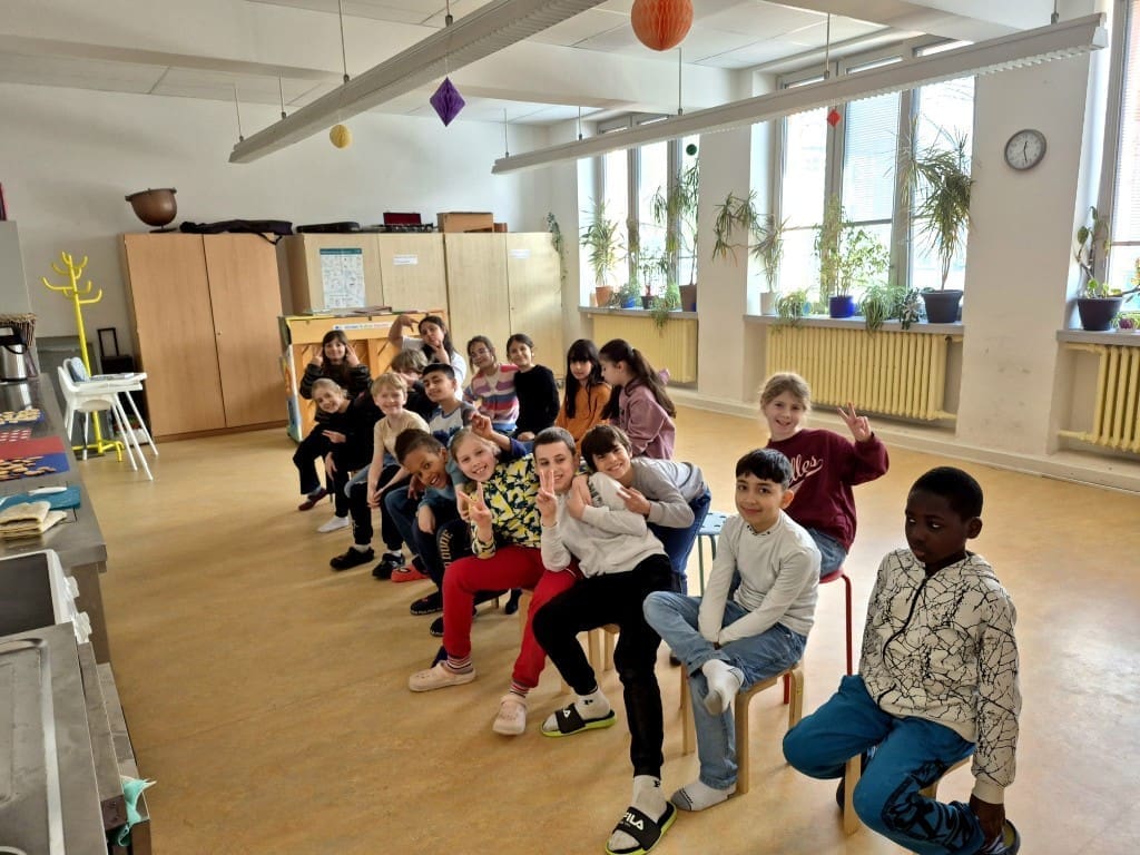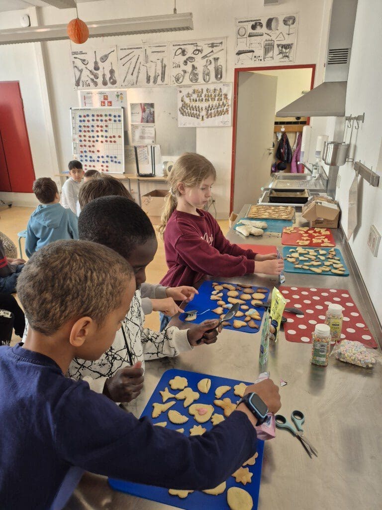 Kurz vor den Osterferien backte die Klasse 4b gemeinsam leckere Osterplätzchen. Zuerst wurde der Teig zubereitet, dann ausgerollt und mit verschiedenen Förmchen ausgestochen.