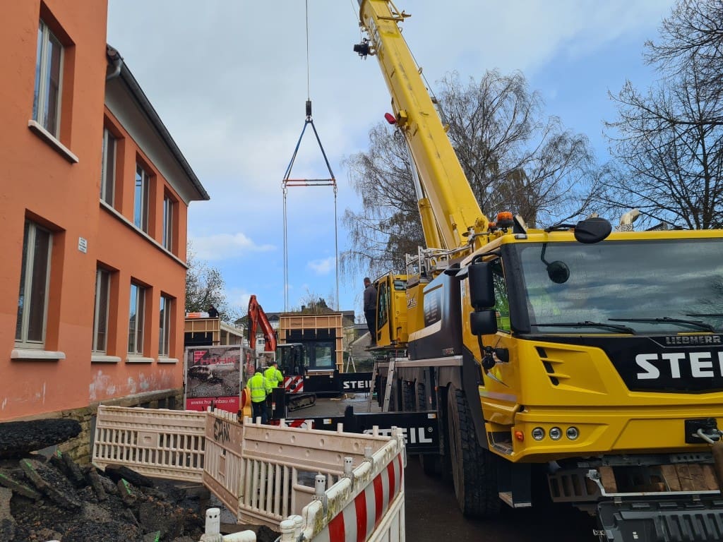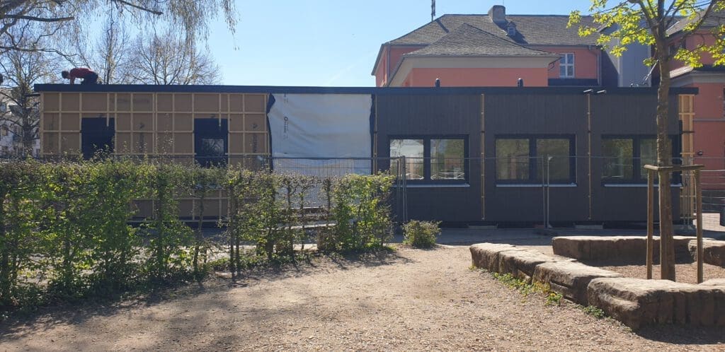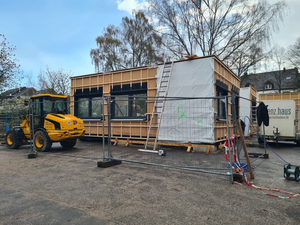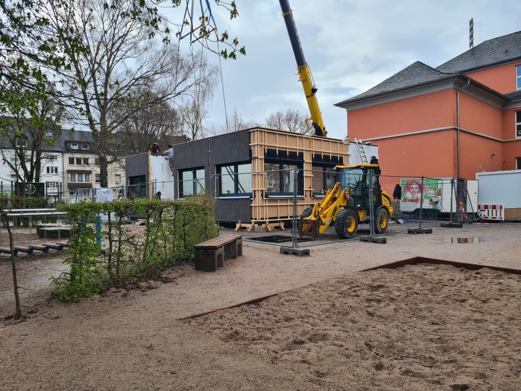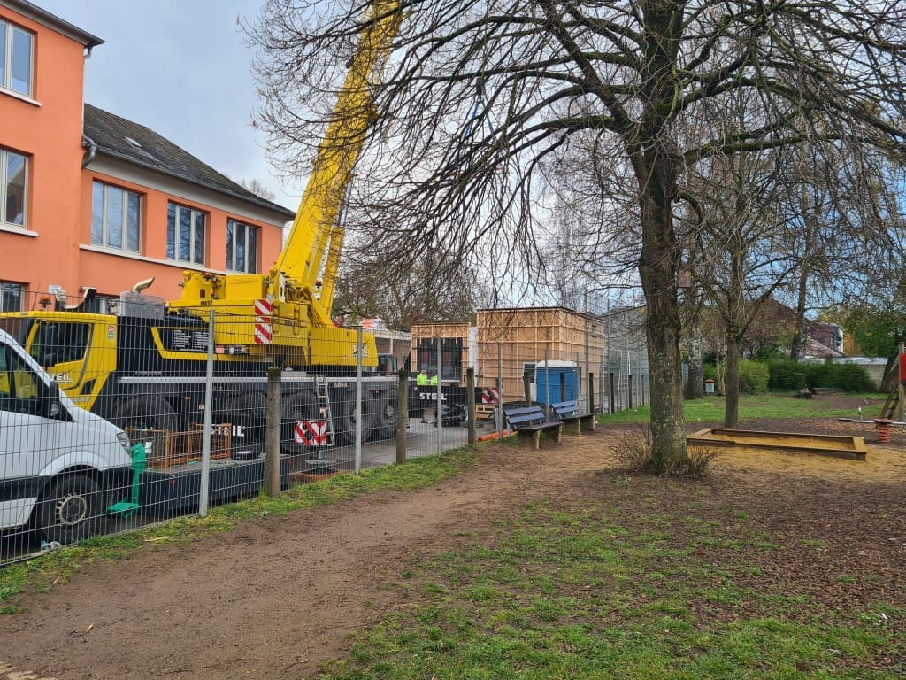 Schon vor den Ferien gab es Bauarbeiten auf dem oberen Schulhof. In den Osterferien sind jetzt die Module für unsere neue Mensa geliefert und installiert worden.