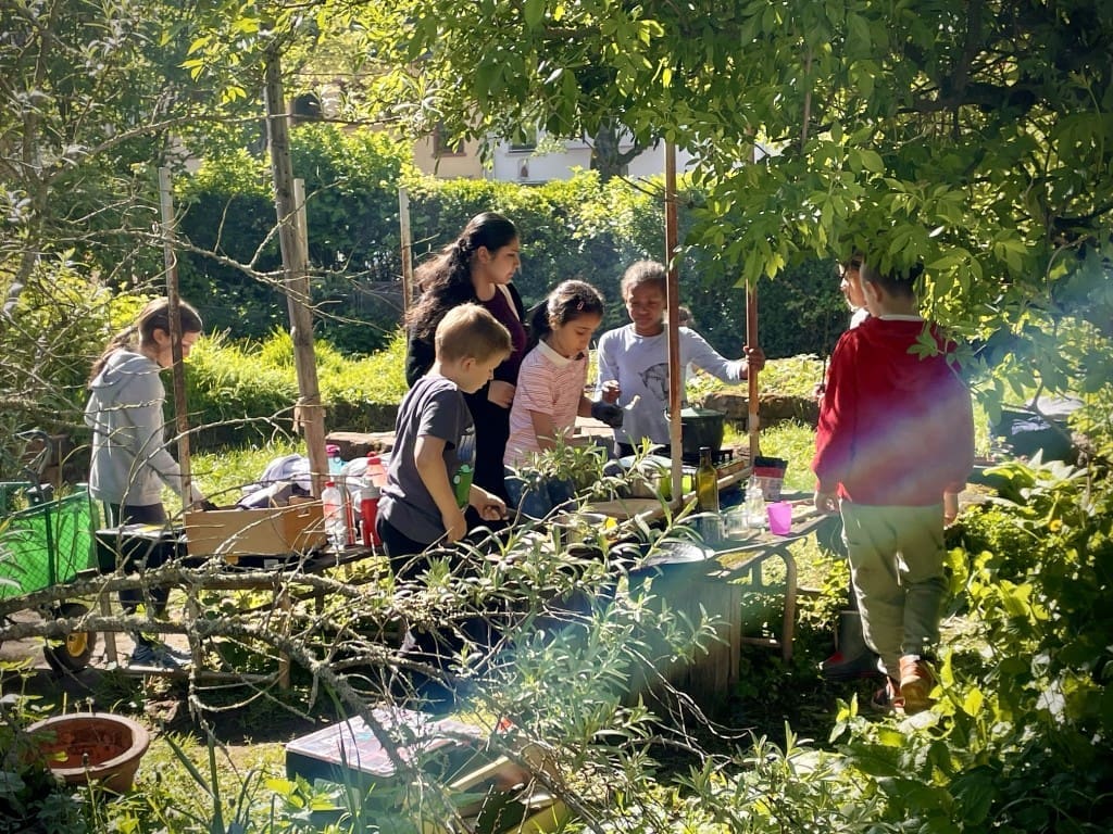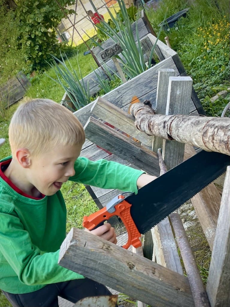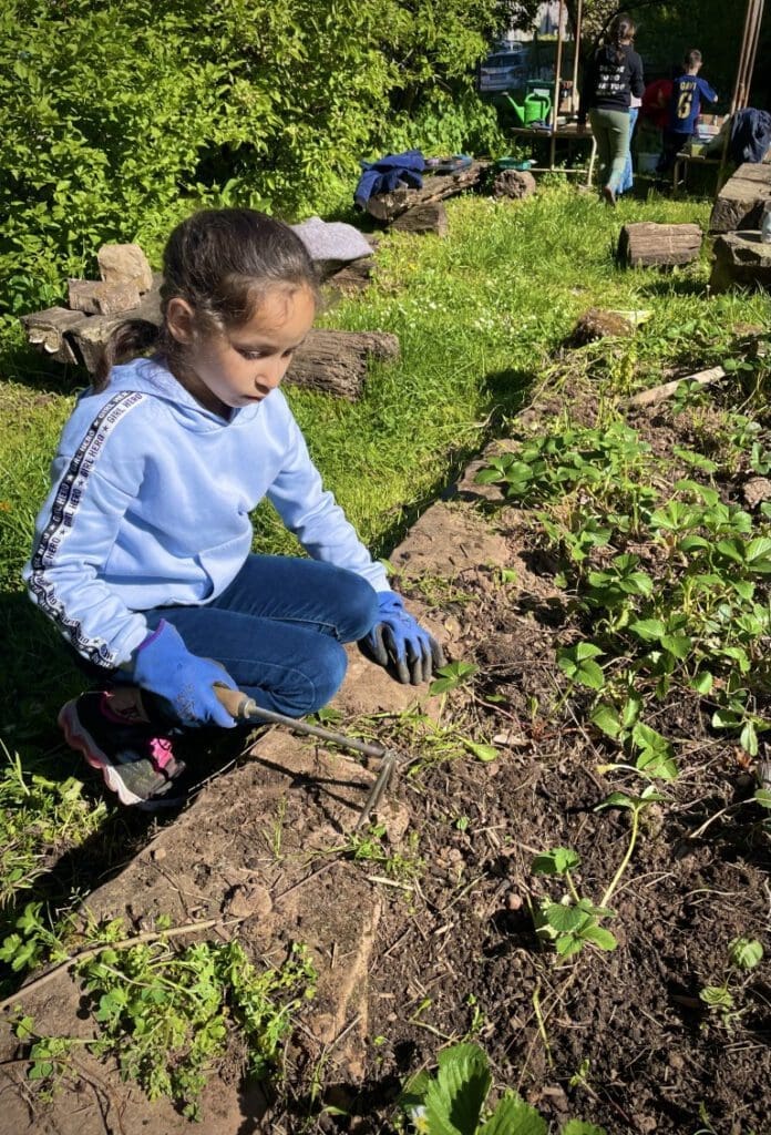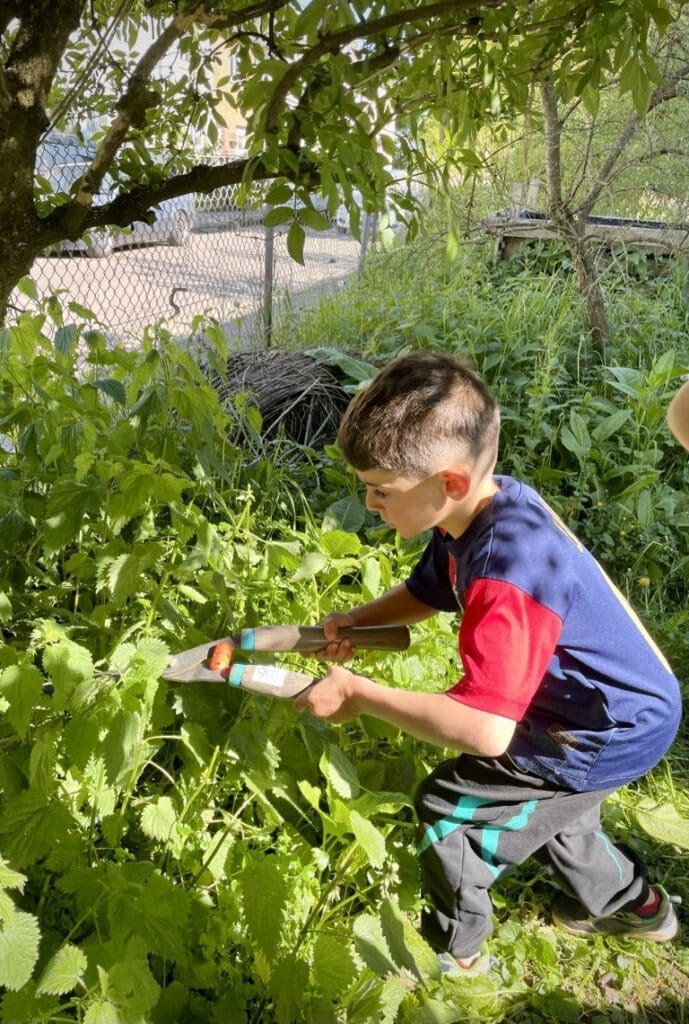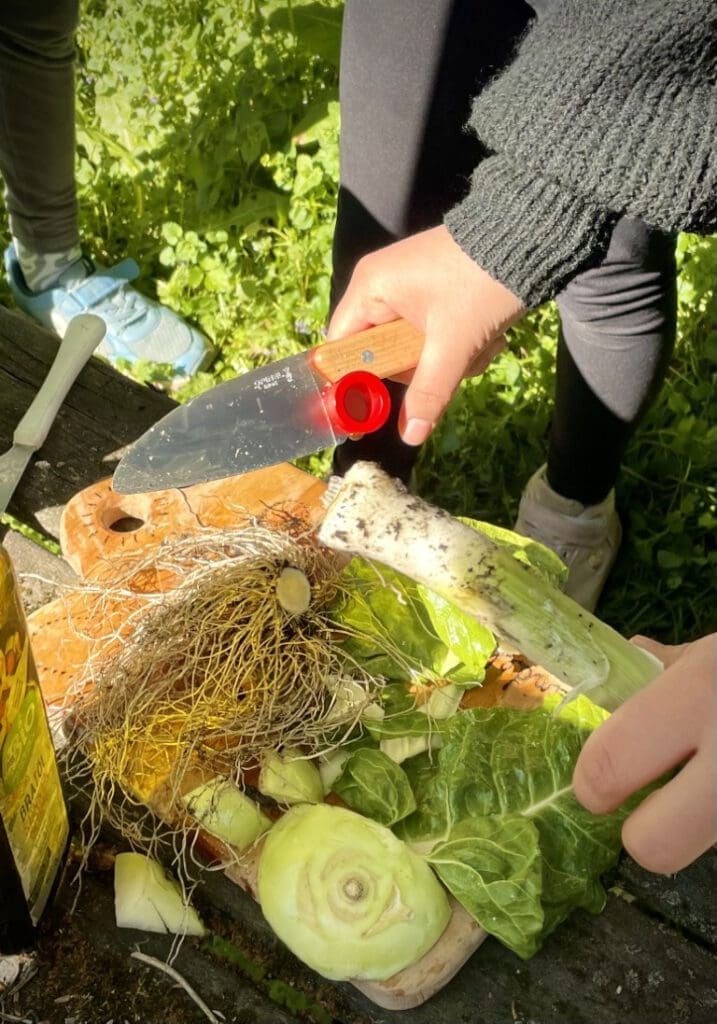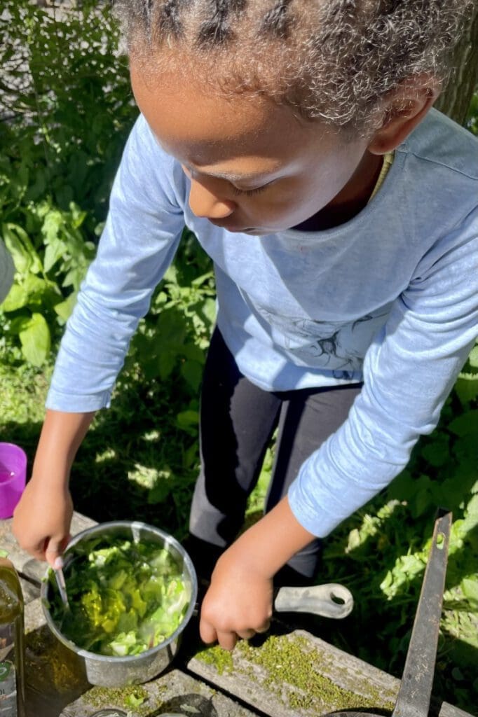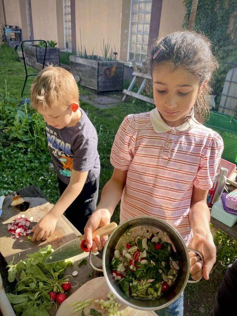 Schön wie experimentierfreudig und neugierig die Kinder sind, und so wandert alles was von Melene oder Dirk als essbar abgesegnet wird, in den Topf: Kohlrabi, Radieschen, Mangold, Lauch, aber auch Löwenzahn, Minze und Brennnesseln! Im Garten legen wir die Erdbeeren frei, es wird gemulcht, neues Gemüse eingesät und gegossen. Und zum Nachtisch gibt es noch eine Matschsuppe aus der Schubkarre 🙂