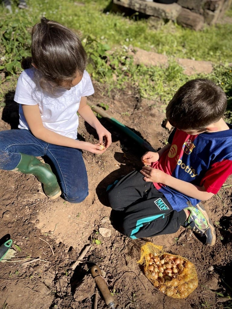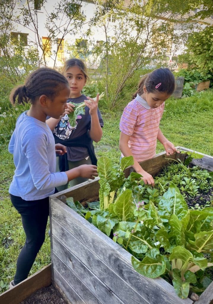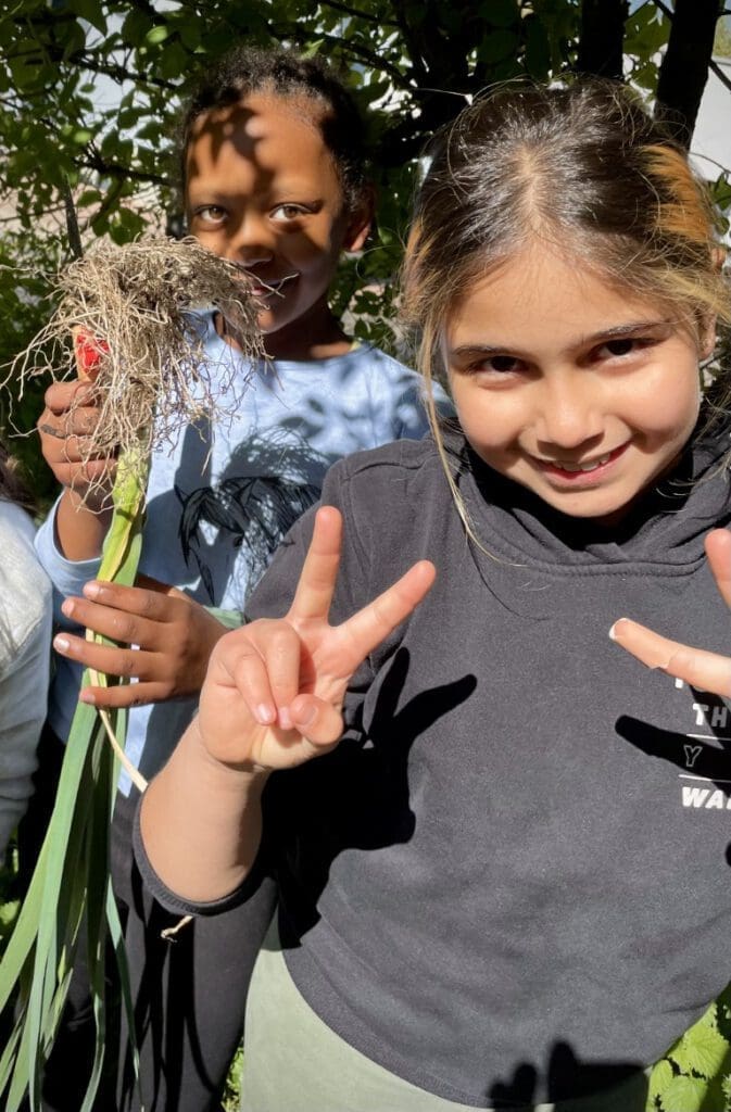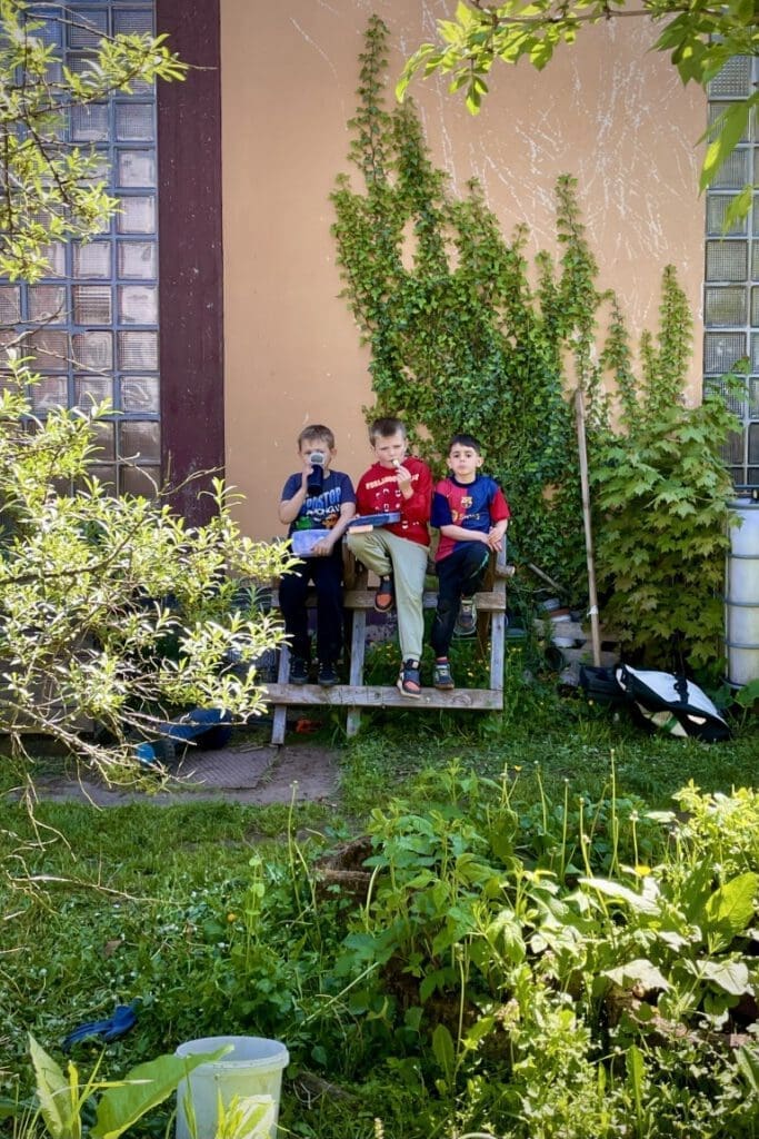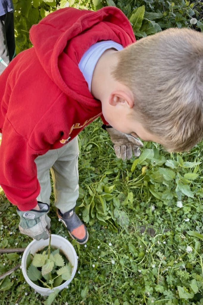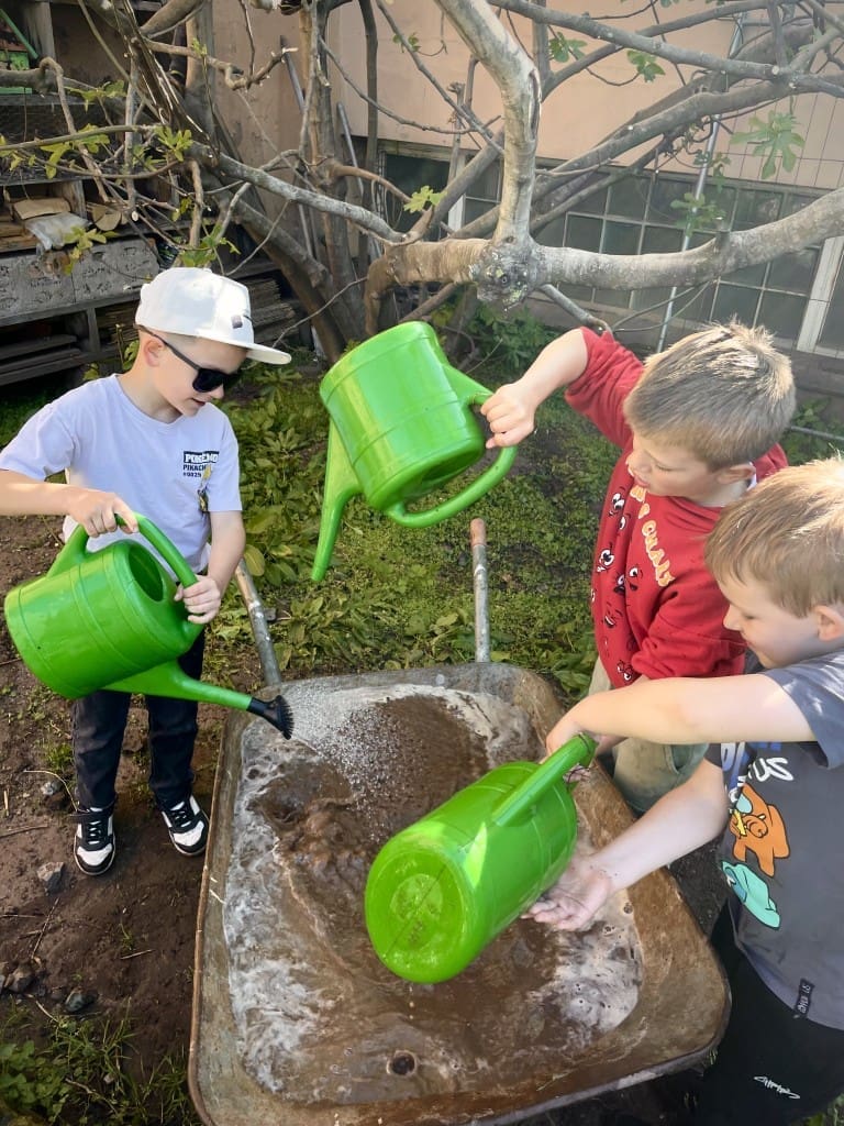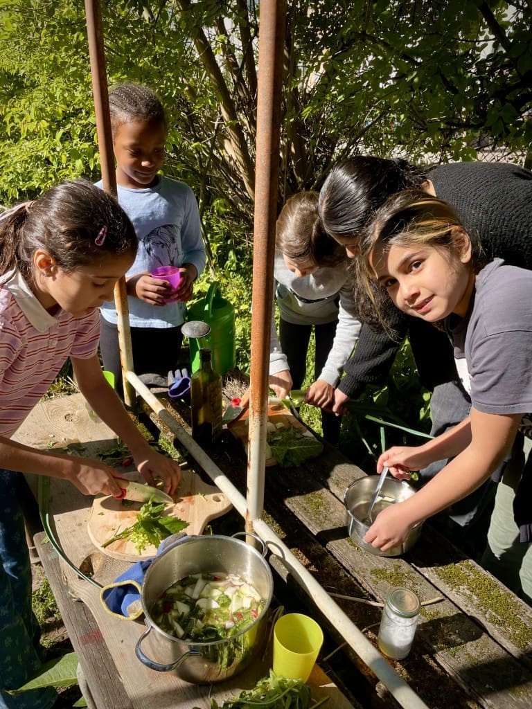 Schön wie experimentierfreudig und neugierig die Kinder sind, und so wandert alles was von Melene oder Dirk als essbar abgesegnet wird, in den Topf: Kohlrabi, Radieschen, Mangold, Lauch, aber auch Löwenzahn, Minze und Brennnesseln! Im Garten legen wir die Erdbeeren frei, es wird gemulcht, neues Gemüse eingesät und gegossen. Und zum Nachtisch gibt es noch eine Matschsuppe aus der Schubkarre 🙂