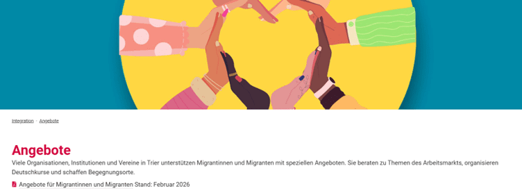 auf dieser Seite der Stadt Trier finden Sie spezielle Angebote (Sprachangebote, offene Treffen, Austausch) für sich und Ihre Familien. Diese Seite wird jeden Monat aktualisiert.